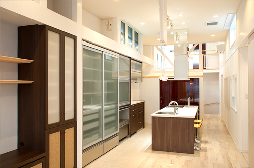 移動式の格子戸で、来客時には目隠しできるペニンシュラ型キッチン。